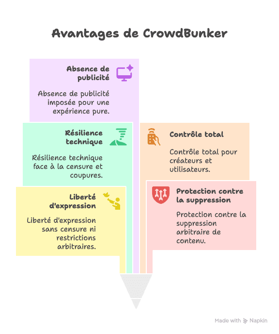 CrowdBunker offre une liberté d’expression élargie, une protection contre la suppression arbitraire et une résilience technique face à la censure ou à la coupure de service. Créateurs comme public bénéficient d’un contrôle total, d’une absence de publicité imposée, d’une expérience utilisateur simple et directe.